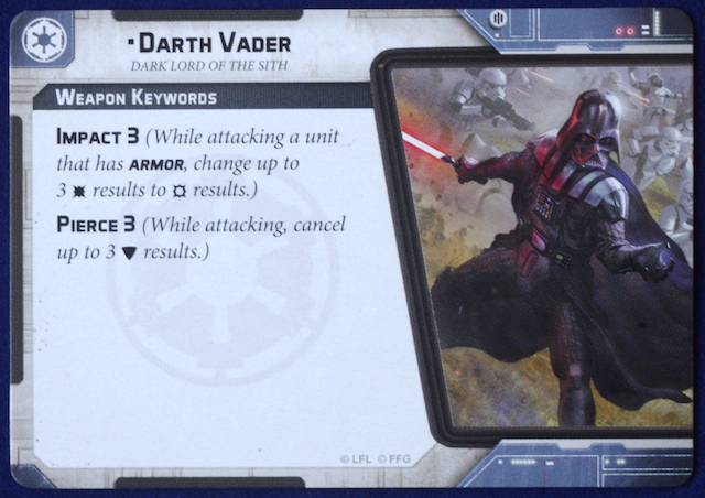 There are pros and cons for each one: Force Reflexes works well as you gain a dodge token, which can then be spent when defending using Deflect, as mentioned above. Saber Throw give a much needed ranged attack, albeit only up to range 2 and using only half the weapons dice, but this still gives a pretty powerful attack of three red dice. Force Push I would personally overlook and go for Force Choke instead. Both affect an enemy trooper unit or mini within range 1, only push causes them to take a speed 1 move whilst choke causes them to take a wound – If I’m within range 1 I’d rather do damage than move them! Finally, Battle Meditation, one that I think is a necessity due to Vader’s slow movement rate, enables an order to be issued to any friendly unit on the battlefield rather than those within range 3 of the leader.
