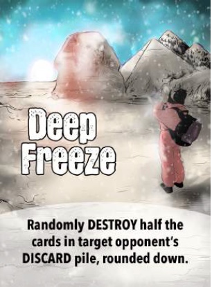 Playing a card is like taking on the role of a mythological God bringing disasters raining down on your opponent. Maybe you cause a great twister that rips through his hand and destroying two random cards, but a twister is difficult to control and so it also destroys one from your hand too! Or you could throw in a shark attack, where you get a glimpse of your targets hand before deciding which card to destroy.