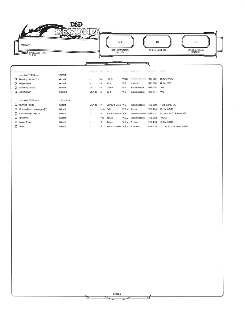 Next up was choosing her starting spells. We read through the available choices and she came up with an initial list. This, however, included next to no offensive spells, which she could have gotten away with if playing as part of a party, but heading out with only a sidekick or two, would be the equivalent of suicide. I made a suggestion or two and this was her choice: Cantrips – Dancing Lights, Mage Hand, Shocking Grasp, and Acid Splash; 1st Level – Burning hands, Comprehend Languages, detect Magic, Identify, Mage Armour, and Sleep. This gave her some interesting options, especially as the non-offensive ones can be cast as rituals, meaning she doesn’t need to have them prepared.