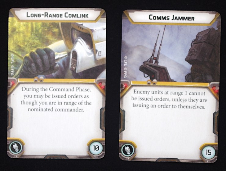 The upgrade cards that come in the expansion include Comms Jammer, Long Range Comlink, Wedge Antilles, and the two weapons already mentioned.
