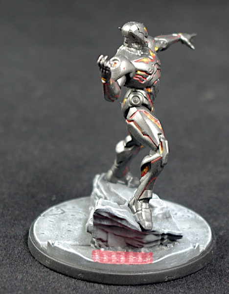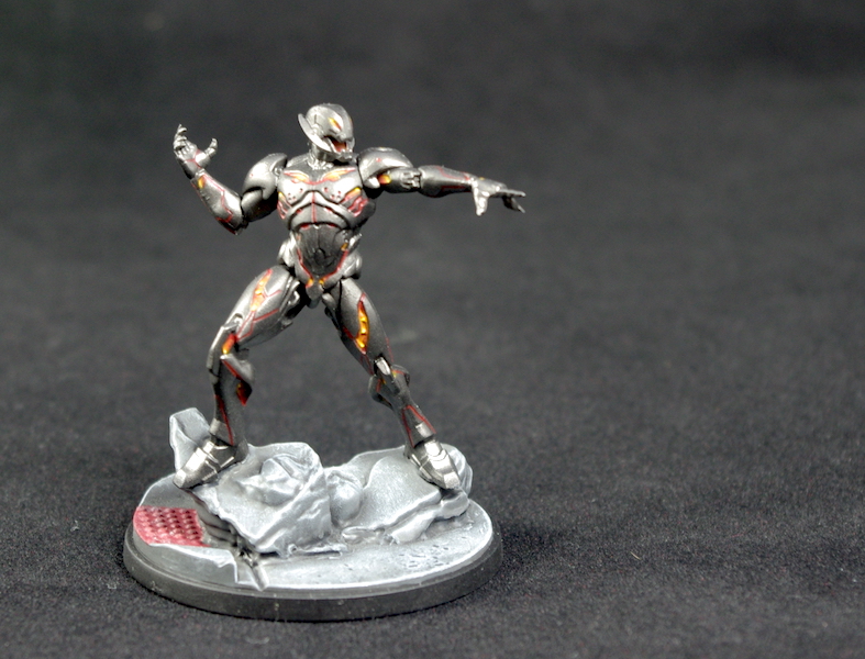 The paint went on beautifully with the airbrush, lovely and smooth, and it dries very quickly. I was going to edge highlight with Chainmail or Silver, but I was impressed with how the paint replicated metal and decided not to bother. I have since painted a few other minis using this paint, and actually Chainmail (Vallejo) highlights it really well, in fact you don’t even have to blend it in, as the way the paint reflects it’s almost impossible to see where the Steel ends and the Chainmail begins. I was almost tempted to revisit Ultron and highlight him up, but again, I couldn’t be bothered – what’s done is done!