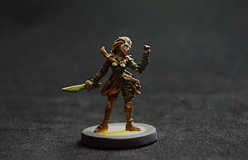 For some reason I missed writing down how I did her hair, but from memory and looking at her I think I started with a base of Charred Brown (VGC), which was washed over with Nuln Oil (GW). I think I used Snakebite Leather (GWO) next, giving it a light dry brush over to pull out the detail. Then I started adding Gold Yellow into it and highlighted it up, adding more Yellow as I went.