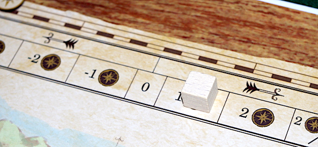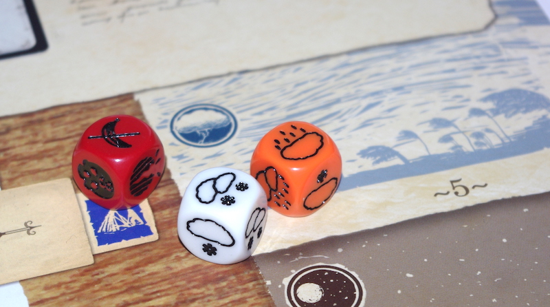 Action Dice – The Build, Gather, and Explore actions require a roll of their respective dice if only one pawn is placed on the action. Each action has three dice: Wound die, the character may suffer a wound attempting the action; Success die, the character succeeds or fails, a failure grants two determination tokens; Adventure die, the character experiences an adventure whilst carrying out the action and draws an appropriate card to resolve.