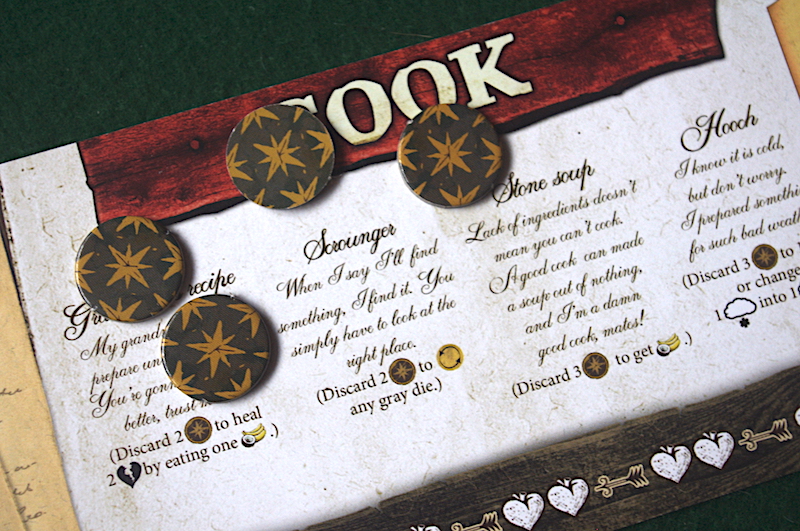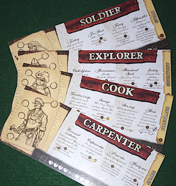 In my version there were four characters to choose from, each with their own unique skills that require determination tokens to use. The characters, Cook, Explorer, Soldier, and Carpenter, each brought something different to the game and, as with everything else, they took a little thought to get the best from. Building up determination was part of it, but timing was another, especially if I only had enough tokens at hand to use one skill.