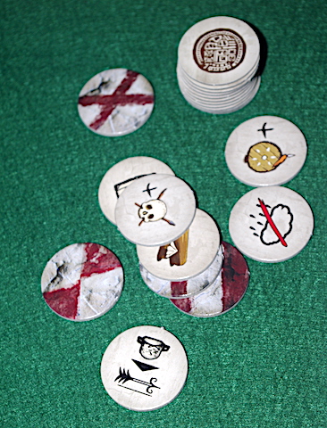 - Night Phase – During this phase characters can use discovery tokens and treasures to heal their wounds. They must also eat, discarding one food per character or suffer wounds. The camp can be moved to an adjacent tile, but this will affect your current roof and palisade level. If you have no shelter built, then the characters take a wound for sleeping under an open sky. Perishable food must be discarded unless you have the means to store it. The scenario round marker is advanced and the first player token passed on to the next player.