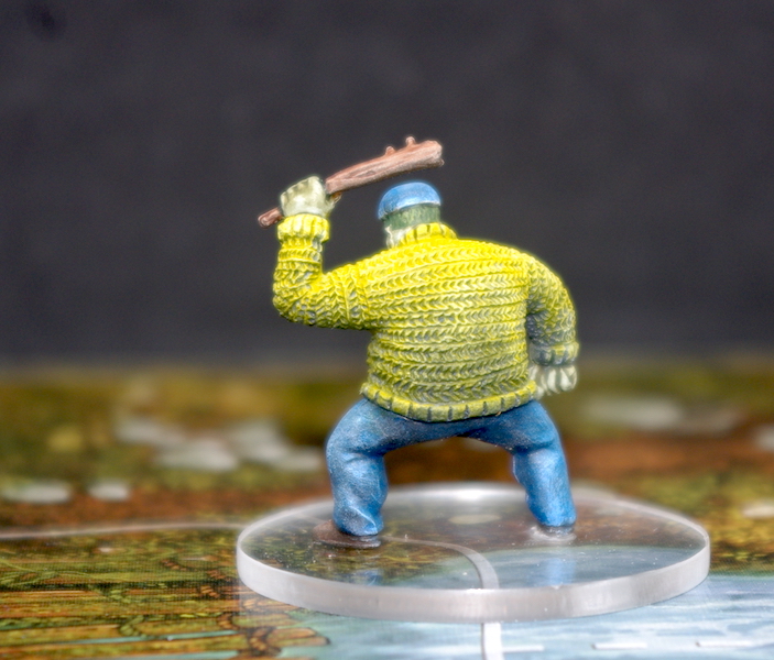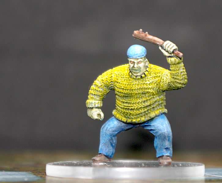 Basecoat and wash for the flesh, dotted in the eyes, and a couple of coats of Darkoath Flesh for the boots and club. Varnish and transfer to the dodgy transparent bases; job done.