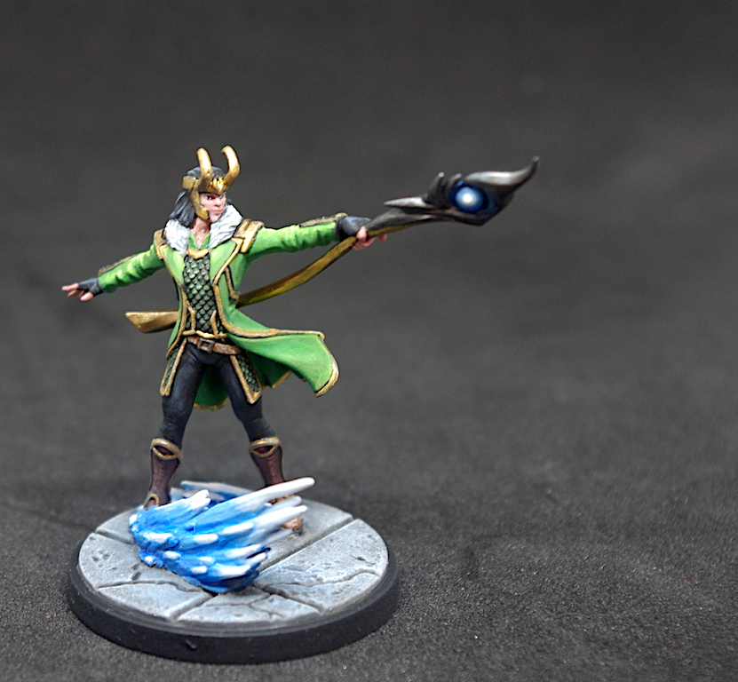 The jacket was a no brainer, as it’s green no matter what version you look at, but the shirt varied, and here it is a mail shirt that is painted silver in the Atomic Mass Gallery (home of MCP). I went with green again, as that tended to match the majority of the comic versions. The greaves (shin guards) also varied a lot, from golds and yellows to blacks and browns – I went with brown, as I thought there was enough gold already. Talking of which, the AM version has the head of the sceptre the same gold as the handle, but whilst that did fit the majority of the Loki comic images, I preferred the version with a steel head. Finally, there was the magic bit at his feet. Loki’s magic spells tend to have a green aura about them, and I was toying with the idea of painting it that way, but I felt it was too much green. In the end, I went with blue, which seems to be how everyone else has painted him too – I did go with blue for the infinity stone in the sceptre, not the green that AM’s version has.
