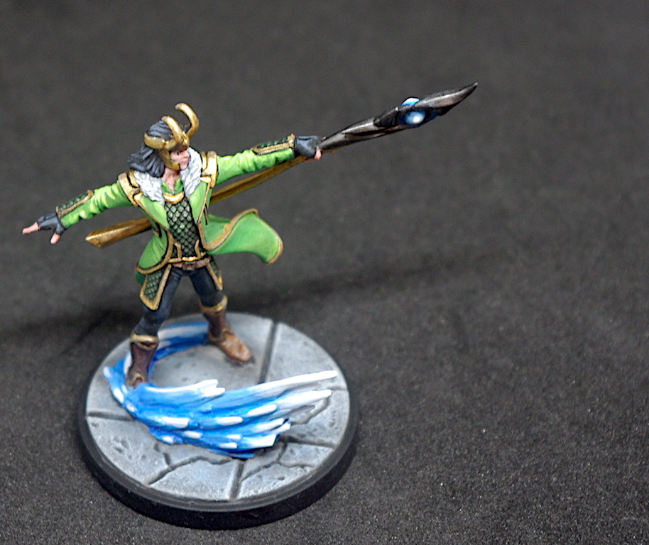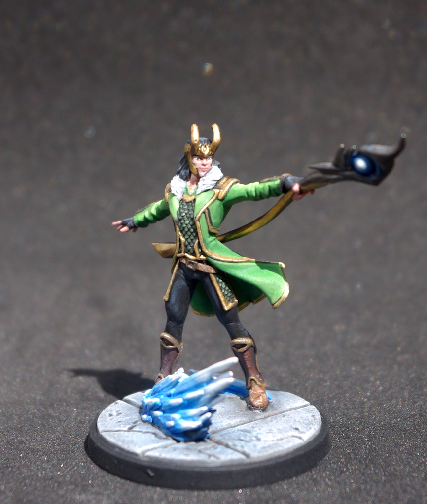 So, Loki. I love this mini. The pose is good and works really well in the game – some poses just look odd when they’re on the table, either very static or worse, doing something that looks totally ridiculous, Myles I’m looking at you (jumping over newspaper dispenser when he’s perched on top of a car!). I also like painting bright greens, so this was an enjoyable experience all round…ish, as we shall see.