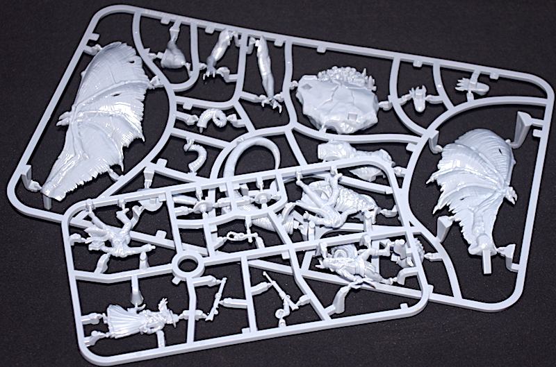 There are three identical sprues, each containing 2-tentacles, 2-hell bats, 1-slasher, and 4-hunrgy dead. A sprue holding the 4-player characters. And a sprue with a large, nicely posed Harbinger. Oh, and there’s a bag full of standard bases for the figures.