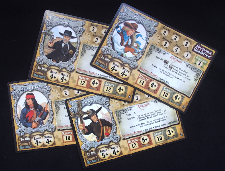 The character cards hold all the stats and abilities for the individual characters, Lawman, Preacher, Indian Scout, and Rancher. They’re a little on the flimsy side, but I can’t see that being a problem. They’re also double sided, identical other than a change in sex. I like this option to play either male or female characters, it’s just a pity that they don’t provide the miniatures to represent both – other than the Rancher the other 3-miniatures are represented by men.