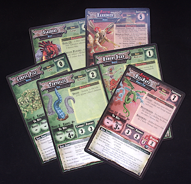 There are 6-monster stat cards, one for each of the earlier mentioned monsters plus one for the corpse pile, whatever that may be (I’m sure I’ll find out later!). These hold all the information I would imagine you’ll need – Size, Initiative, abilities, To Hit bonus, etc. There’s also an elite chart at the bottom, when rolled on gives the creature a special ability. Flipping these cards over upgrades the creature further, to a ‘Brutal’ form.