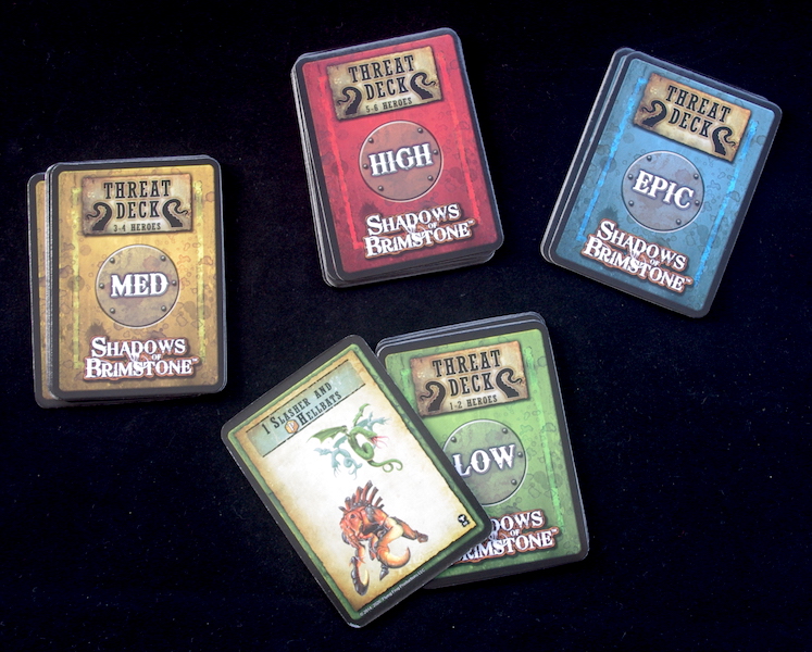 I’m not going to bore you by looking through all of the decks, but as I glance through them there are a few that catch my eye. I like the Threat Decks – Low, Med, High, Epic – which appear to tell you what monsters you’re going to be up against, with many of the higher threat levels telling you to draw a number of lower threat cards on top of what they throw at you.