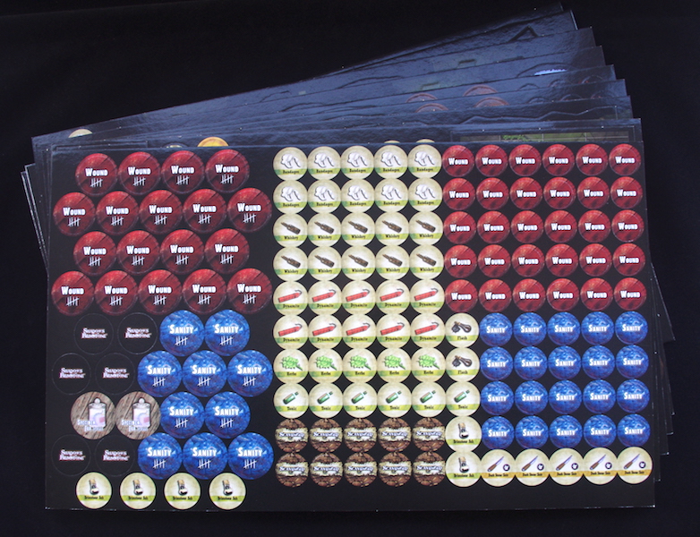 Next I open up the sealed cards and separate them into their individual decks, there are lots of them – Gear, Artifacts, Starting Gear, Personal Items, Hero Starting Upgrades, Map Cards, Darkness Cards, Encounters, 4-Threat Decks, Loot, Growing Dread, World Cards, Scavenge, Other World Map and Artifact decks, and Preacher Sermon Cards… Phew, that’s a fair old number of decks. On top of theses there are several aid cards, showing what some tokens do and highlighting certain rules – sounds useful!