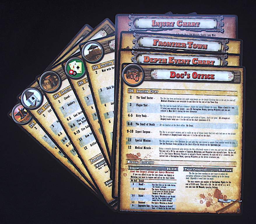 Working backwards, the reference cards detail the town locations and what can be done in each – Blacksmith, Church, Doc’s Office, General Store, Salon – there are also cards for a Frontier Outpost, Frontier Town, Madness/Injury chart, and a Depth Event chart, all of which seem straightforward and delve into the roleplaying aspect of the game, as each character can wonder off and do what they wish in town.