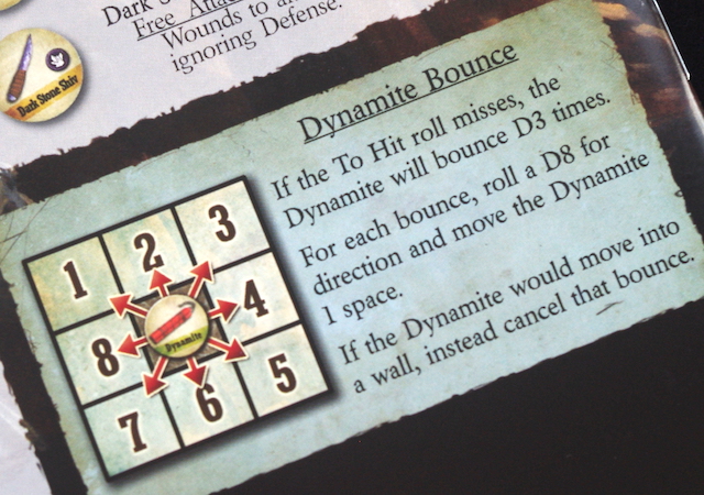 The rulebook is equally well produced, but with less art and a lot more words! At 39-pages there’s a lot to take in here, and I’ll be interested to see how well written it all is in terms of trying to learn the game. With the prospect of all the glitches having been ironed out, this revised edition shouldn’t be too problematic, we shall see. A quick flip through, though, really excites me, as the game has everything I look for in a dungeon crawler – lots of dice to be rolled, upgradable characters offering lots of personalisation, and a good variance to the gameplay. My eye was drawn to the fact that, if you throw dynamite, there’s a bounce table to see where it lands if you miss – it’s the little things that please me!