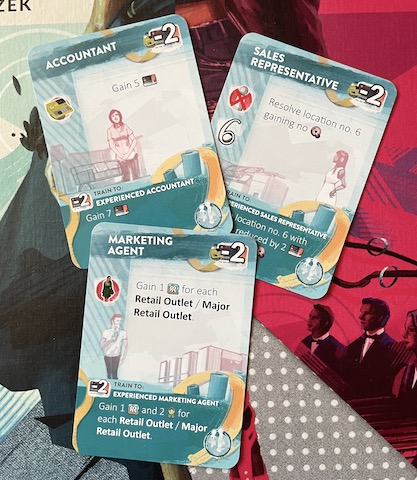 My favourite part was getting an engine going. The buildings you buy, the people you hire, and the contracts you form, can all boost your options during a turn, and I found those that allowed you to take actions without placing a worker the most useful and fun to play. If I had cards that enabled me to draw lots of new designs, then I could concentrate my workers on getting the materials I needed to make them. As the game progressed, the better my engine became, as I’d be able to activate more actions without workers and increase the number of things I could do. Of course, I still needed to think through the sequence of things and make sure I’m not wasting a worker somewhere, and the fact that anything gained from the board comes into action straight away needed to be remembered. For example, if I grabbed a Sales Rep, I could then gain something from the Local Manufacturer in the same round, so it’s possible to work that into your strategy when placing those workers.