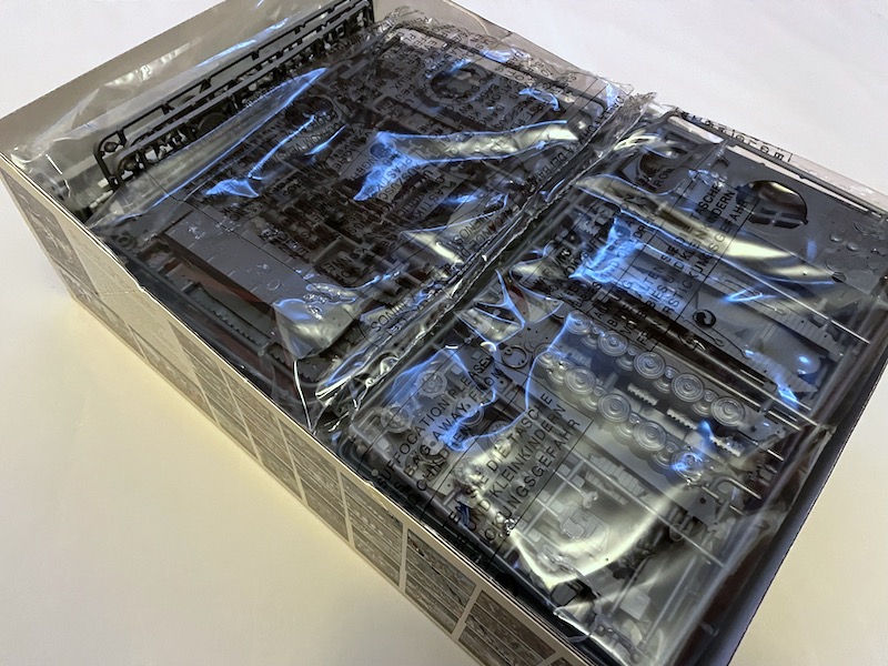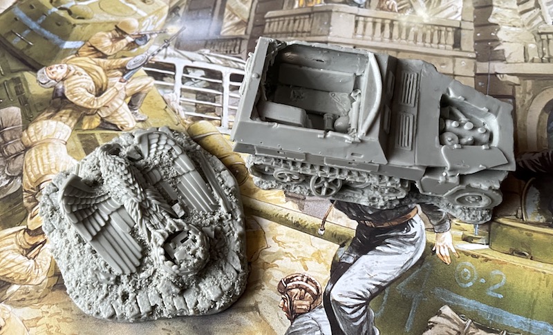 I’m going to start opening some of the little, bubble wrapped packages next, and there are plenty of them. First up, one that says ‘Scenic Pieces on the label. Inside there are two items, a burnt-out Sd. Kfz 250/1 and a shattered German Eagle. Both pieces are resin and look superb, especially the Sd. Kfz 250/1, which has a lot of fine detail. I thought it looked a little on the small side, especially when you compare it to the size of a standard infantry man, but when I compared it to the Tiger II on the sprue it was in proportion (the Tiger II was almost twice the length of the Sd. Kfz 250/1). Getting the dimensions up on the web, at 6’3″ wide and 5’4″ tall, the dimensions were comparable to the infantry, so I guess these things were just smaller than I reckoned on in real life!