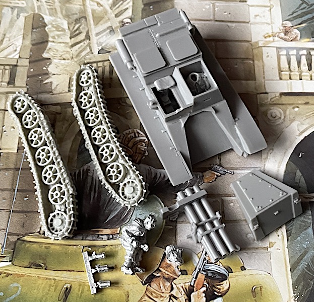 Borgward Wanze Ausf.C. That’s a bit of a mouthful! The Borgward Wanze is a tracked vehicle with a six-barrelled rocket launcher mounted on it – nice! This is another resin kit but with a few metal pieces – a crewman, the drivers head, and what I believe to be the exhausts. It’s a really simple kit; the hardest part is going to be joining the drivers head with the rest of his body – a pair of tweezers will be in order methinks. I can see now why the vehicles feel out of proportion with the infantry, me being new to Bolt Action and all that. The infantry are beefed up, while the vehicle crew are of more realistic proportions – In terms of height, they’re about the same.