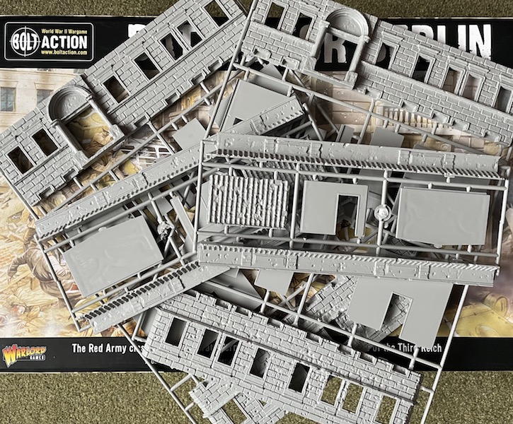 With all the small bags out of the way I can now lift out the buildings. Two identical Berlin Houses, and they look gorgeous. They are two-storey with divided interiors, so they can be entered by units, providing you don’t glue it all together that is. The externals are nicely done, with plenty of detail including bullet holes. It’s all sturdy plastic and looks very good quality. There’s no internal detailing, which is a shame but the norm for this kind of thing, and the scale looks right compared to the infantry figures.