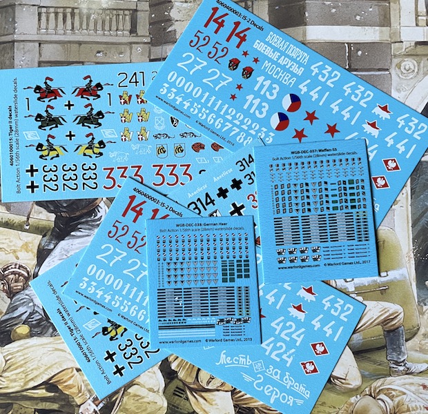 In the bottom of the box there lies various bits and bobs, including the missing head, hurrah! There are another 20-round bases and 6-oval ones for the prone figures. Decal sheets, 6-off, and oh boy, are some of them small! It’s been years, and I’m talking 30+, since I last had anything to do with these, let’s hope my skills have improved because I was never any good at putting the damn things on!