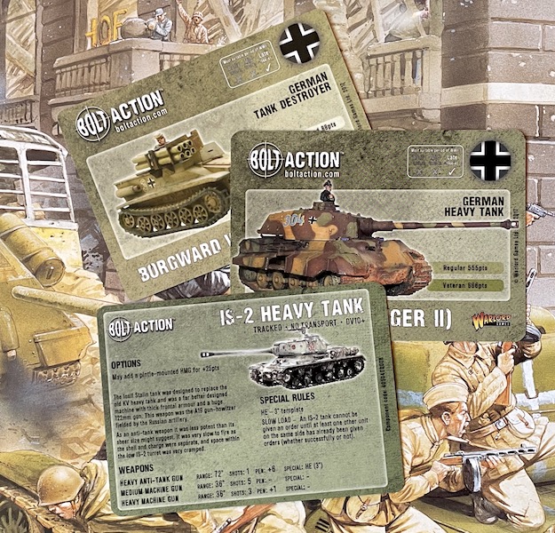 Three stat cards, one for each armoured vehicle, are included. I’m the kind of person who makes stat cards for each unit, especially when I’m new to the game, so these will save me some time. Each side of the card shows the vehicle in a different paint scheme and also includes details such as points cost, weapon range/shots/penalty/special, special rules, and suitable periods for use.