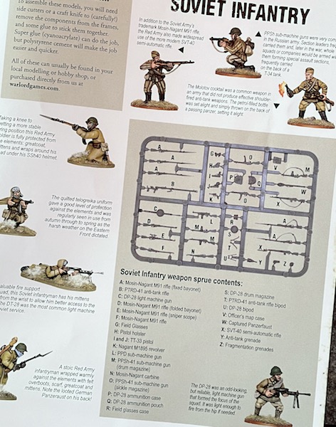 Sure enough, here are the four sprues of Soviet weapons, each identical. These look fab, with some fine detailing and the options they present mean plenty of thought needs to go into squad building before assembly begins. There are SMGs, rifles, pistols, LMGs, frag grenades, field glasses, anti-tank rifles, and so much more, even a Panzerfaust, which Soviets used whenever they could get their hands on them. I like the fact some weapons have slings attached and some of the rifles have bayonets – there’s a lot of choice here.