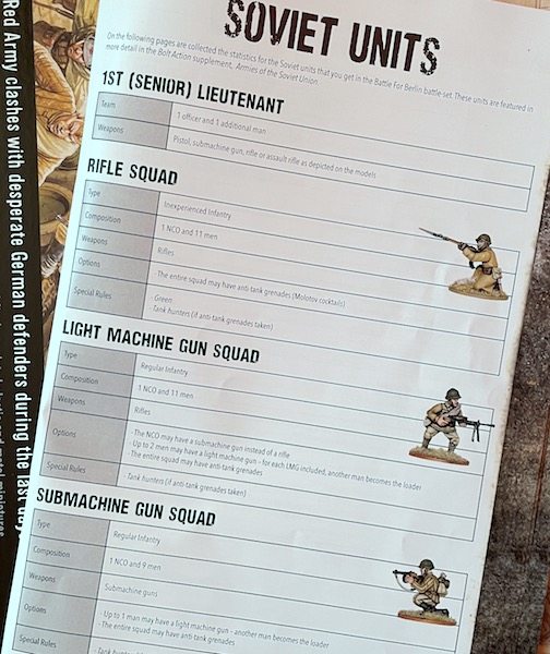 Finally, The Battle for Berlin booklet. Scanning through I find the first 4-pages full of history, then we move onto some additional rules, such as moving and shooting in rubble. Then there are 3-scenarios, which are based on specific setups of units, for example: 1 Rifle squad (12 men), and you’ll need the appropriate army selectors to equip them, rather than a points total with suggested unit types. The scenarios are all played on a 4′ x 4′ surface and cover everything in the box.