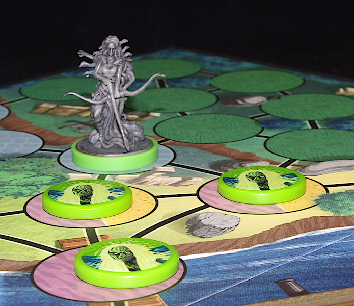 Having the four characters and their sidekicks all in play at once meant a lot of thought had to go into positioning, especially trying to keep away from Medusa, who would do damage at the start of her turn to a hero in her zone. At one point, Arthur was pinned by two harpies and Alice, unable to move, and I had to sacrifice the Porter to get him out of there, it was great fun.