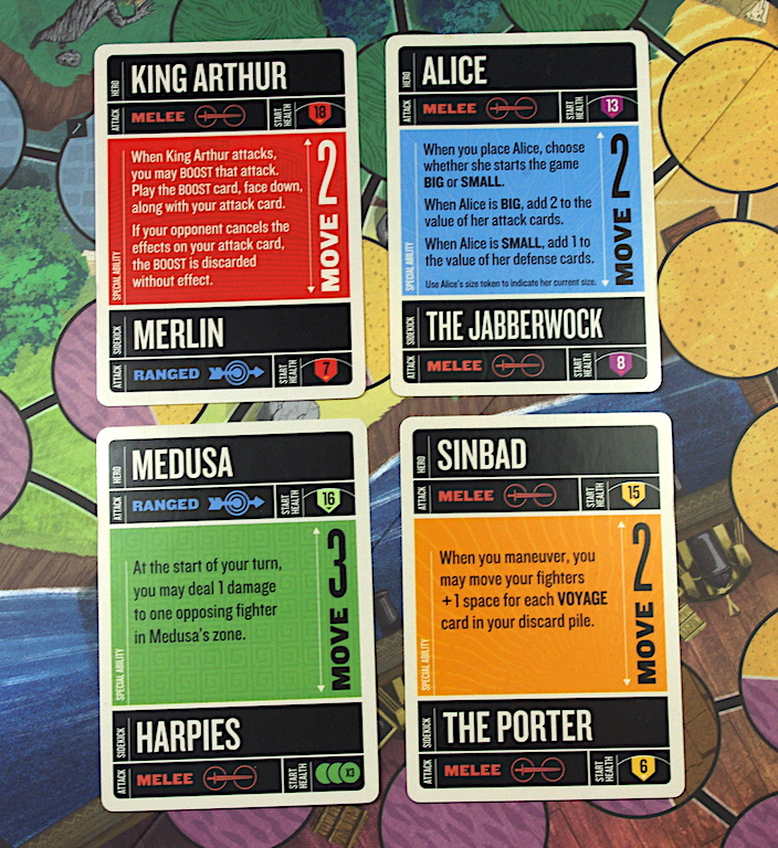 The character card specifies the starting health of the hero and their sidekick, as well as their movement and types of attack, ranged or melee. Any special abilities are also listed on the card.