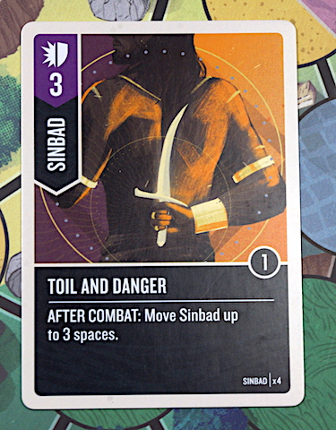 This was a superb game mechanism. Not only did it control the length of the game, bringing it to a dramatic climax if neither character could down the other, but it also had a deciding effect on strategy. I liked playing cards that enabled me to attack and then leap away, such as Sinbad’s Toil and Danger, as it meant my opponent had to react and usually do at least one manoeuvre action in their turn.