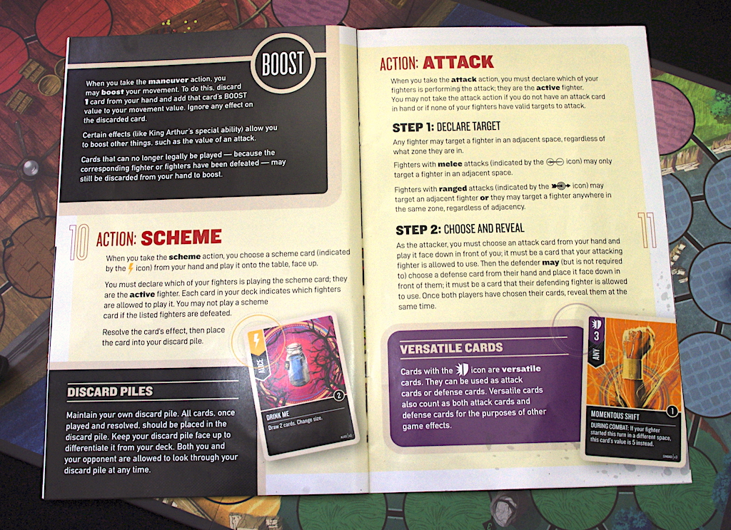 - Scheme – The player declares which of their fighters is scheming and plays a scheme card from their hand (cards indicate which fighter – hero or sidekick – are allowed to use the card). The effect of the card is then resolved.