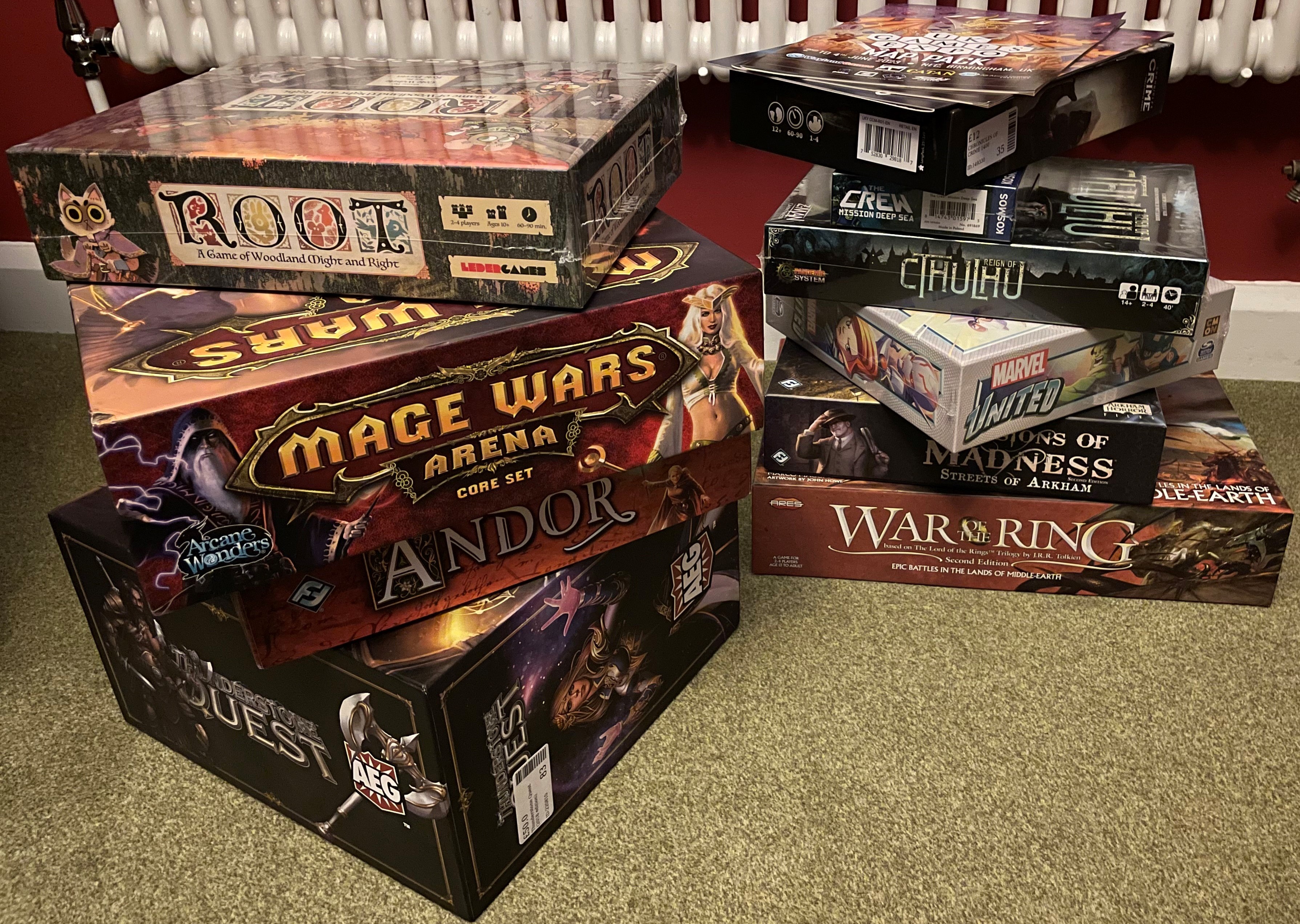 Legends of Andor was quickly added to the pile, as was Mage Wars Arena, a game we were both keen to play. Much more could have been added to the pile: Mage Knight, Core Space, Imperial Assault, Gaia Project, Mystic Vale… all were on our wants list, but Thunderstone Quest weighed a ton and money was now getting short, so we called it a day.