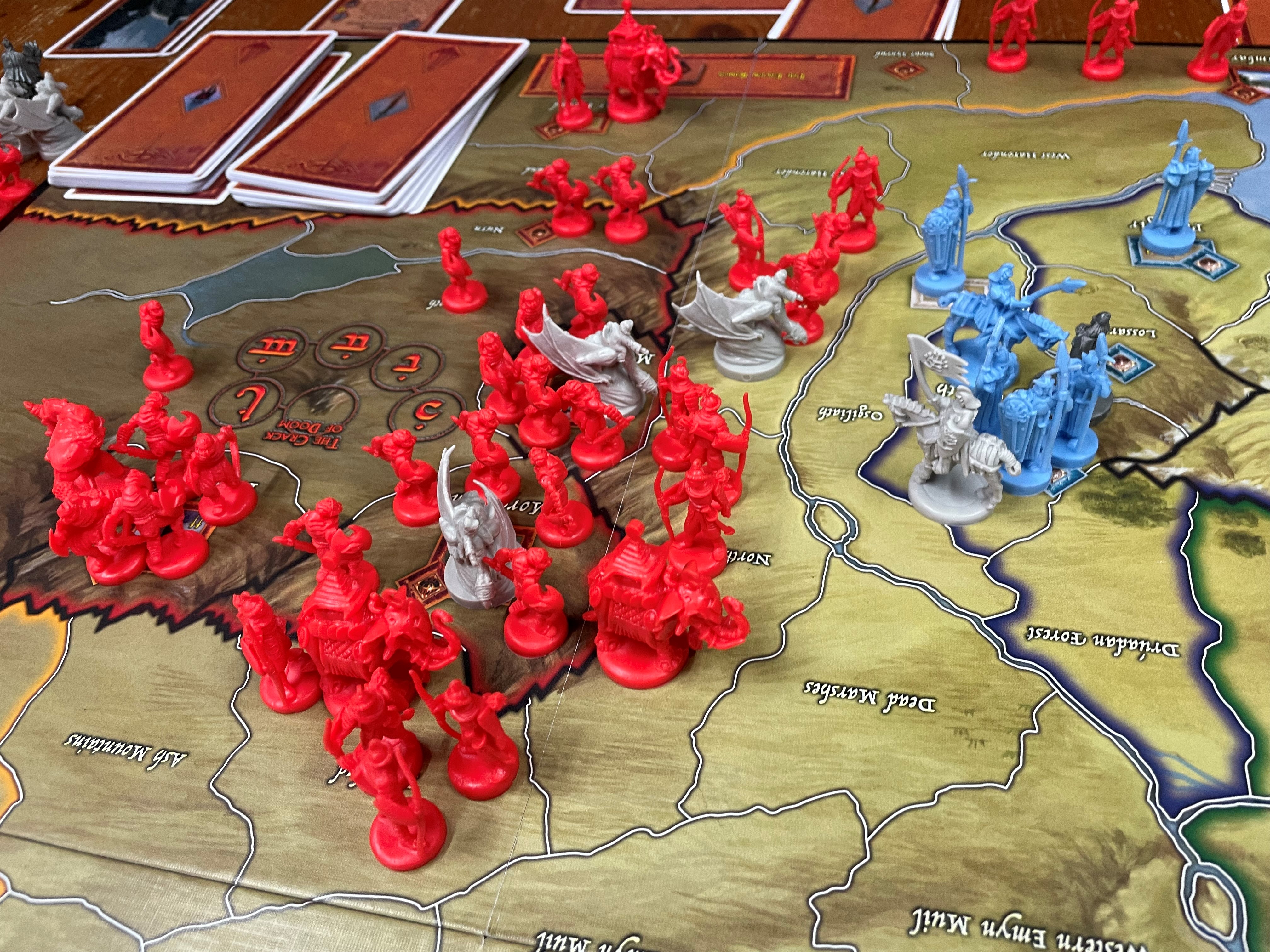 She realised that, in the first game, she hadn’t been aggressive enough. You see, one of the enticing game mechanisms of War of the Ring, is that when one of the free nations units is defeated they get removed form the game, never to be seen again, whilst those of the dark forces get placed back in the reserve, thematically representing the never ending forces that Sauron could command.