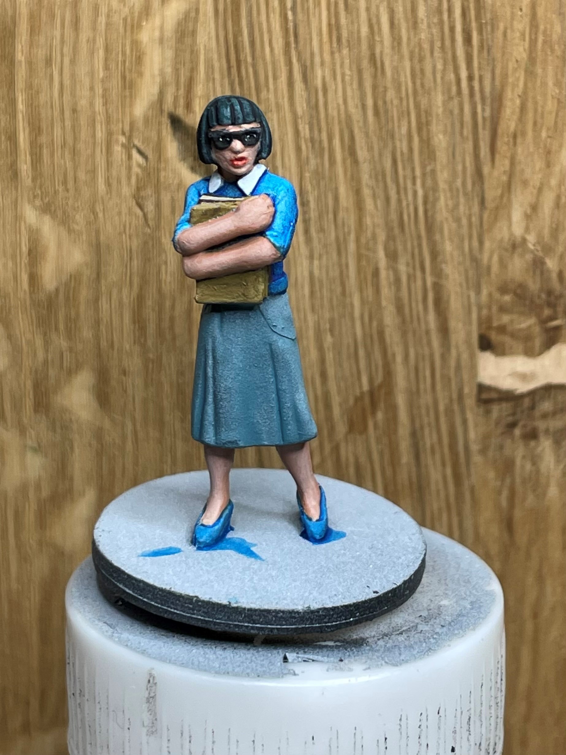 Her hair (Lotus Black), Jumper (Mystic Blue), and skirt (Space Grey) were all painted with Xpress over Zenithal. All worked quite well and I didn’t feel the need to further highlight. I think it was helped by the fact that the zenithal prime wasn’t as strong here as on Silas, and so the colours were more consistent. I did try and paint her eyes in through her glasses, but the frames were very thick and now she looks like she’s wearing dark sunglasses!